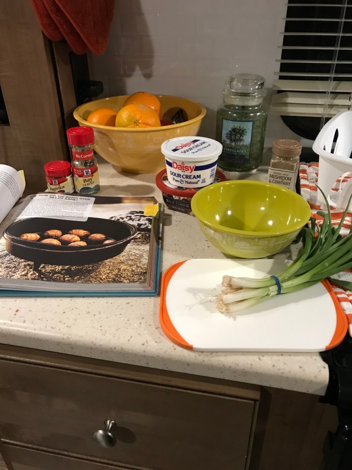 Cast iron cookware – We started with a Dutch oven and grabbed the skillet I never use at home. Frankly, I like to throw everything in the dishwasher at home. In the trailer, I have to hand wash everything anyway so the cast iron isn’t much more effort. So far, we have done ribs, a roast, buttermilk chicken, potatoes and a few desserts in the Dutch oven. Our consensus is that we prefer the baked goods in the Dutch oven. The meats don’t get enough of the smoky flavor we like.