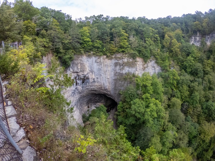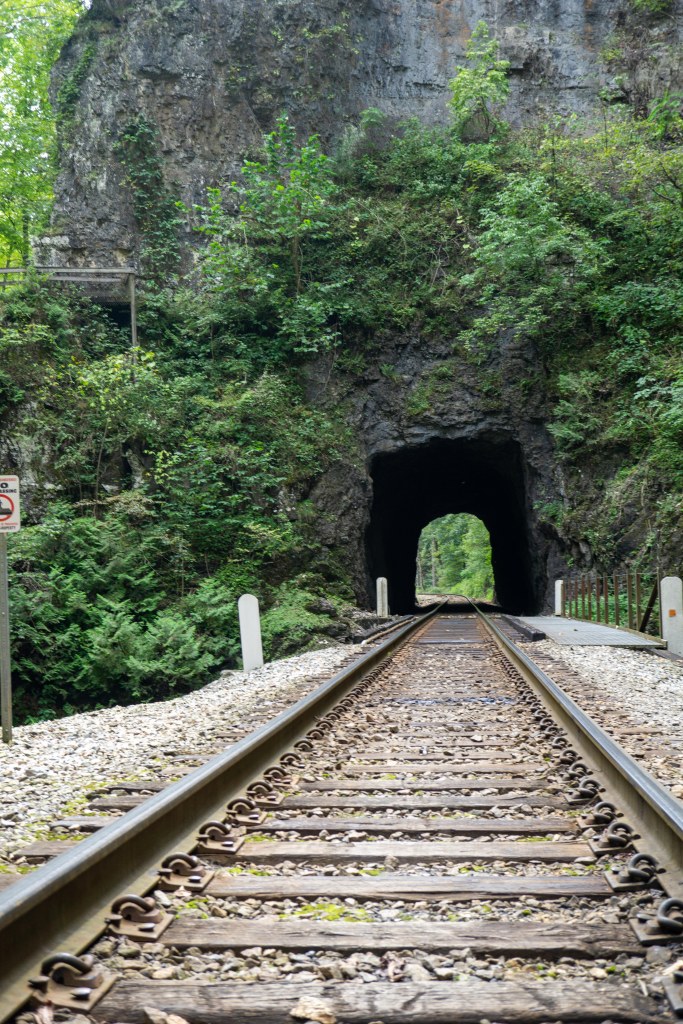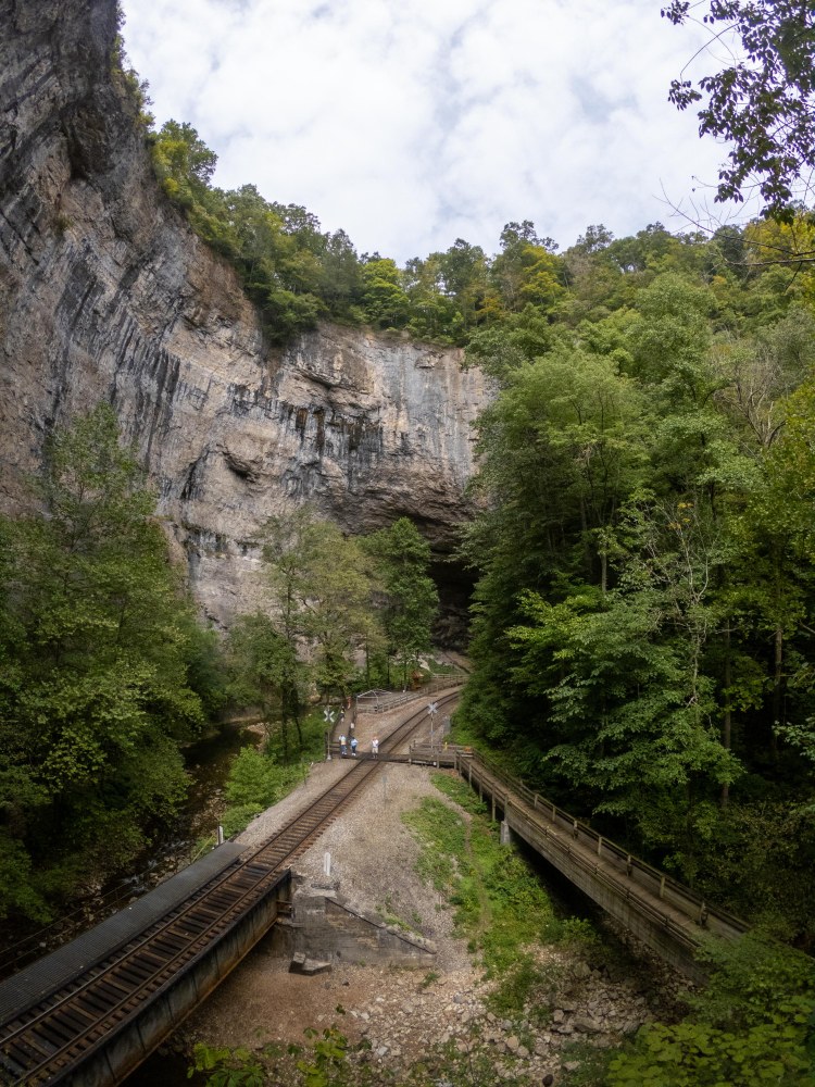 Descending from the Visitor’s Center is a trail down to the tunnel itself. A chair lift is an option for those unwilling or unable to hike. Campground guests received free passes for the lift due to the COVID-related pool closure. As we had the dog with us, we opted for the series of switchbacks. The natural tunnel has been home to a railroad bed since the late 1800’s and a dynamited tunnel allows for easy passage through the area. The tracks are apparently active for coal transport, and I can’t imagine sharing that limited space with a giant locomotive. The park is not aware of the train’s schedule, so such an encounter would be by luck.