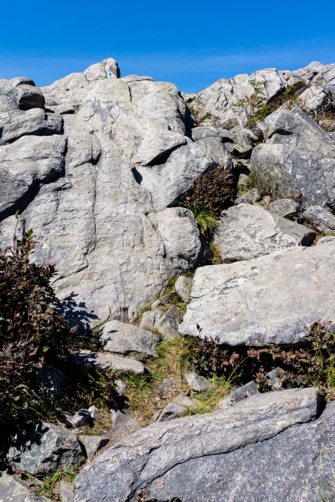 I am not 100% confident of which trail we hiked in the area. I think we set out on the Rhododendron Trail, but the social and pony trails make way-finding a little difficult. Fortunately, we could see for miles and navigate where we wanted to go. We exited the state park into the neighboring Mount Rogers National Recreation Area and climbed a nearby unnamed (?) peak, following blue blazes. Overall, we covered a little over three miles in our trek.