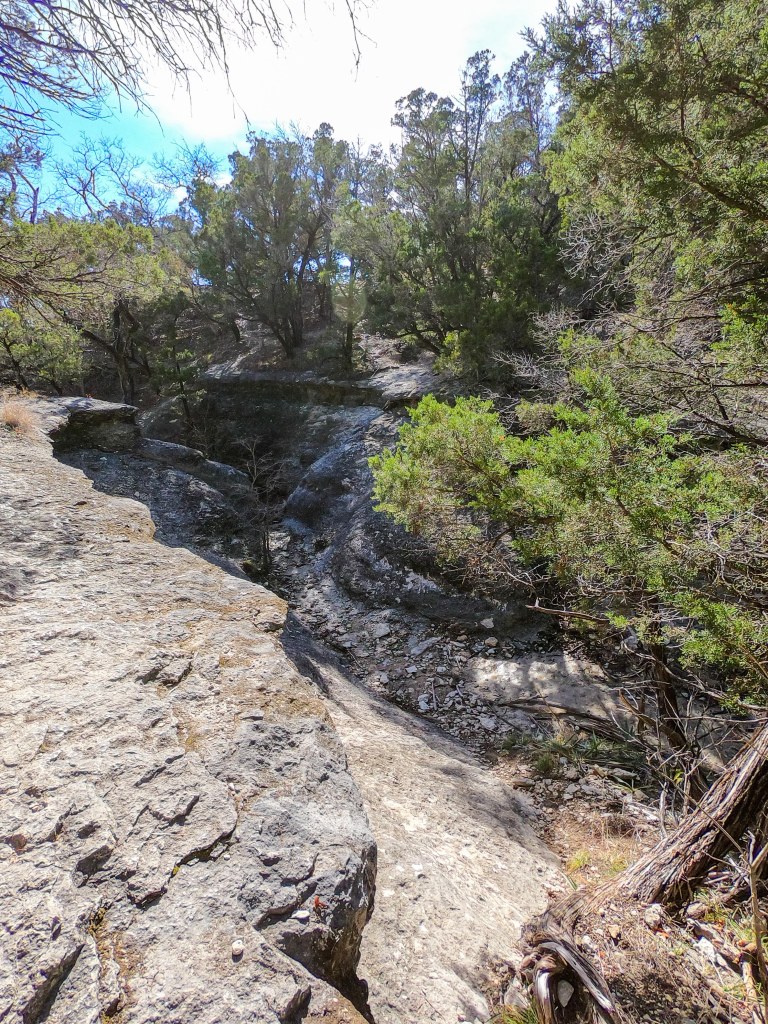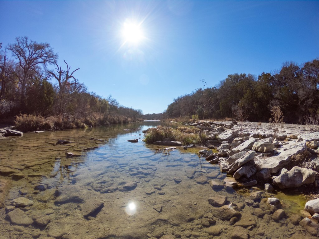 The previous day’s rain gave way to beautiful blue skies. Although the calendar was firmly in December, at this latitude it felt more like late fall than almost Christmas. The park is small, and so Blue and I set out from our campsite. A short walk along the creek lead to the main dinosaur footprint area. I had read that the footprints were variable in their visibility and may not be seen at all in periods of high or cloudy water. My expectations were low given yesterday’s downpour.