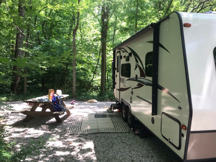 The campground was constructed in the 1970’s and is definitely set up for tents and smaller trailers that were more popular back then. I booked a site for a 20ft trailer. Technically, I clock in at just under 22 feet, hitch-to-bumper, but find that most reservation systems account for camper dealers who insist on touting only the size of the interior. I would have been fine if I had arrived with enough light to clearly survey the area. But in the dark I backed in a little too far to the driver’s side.