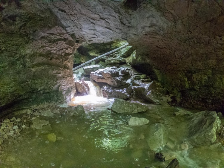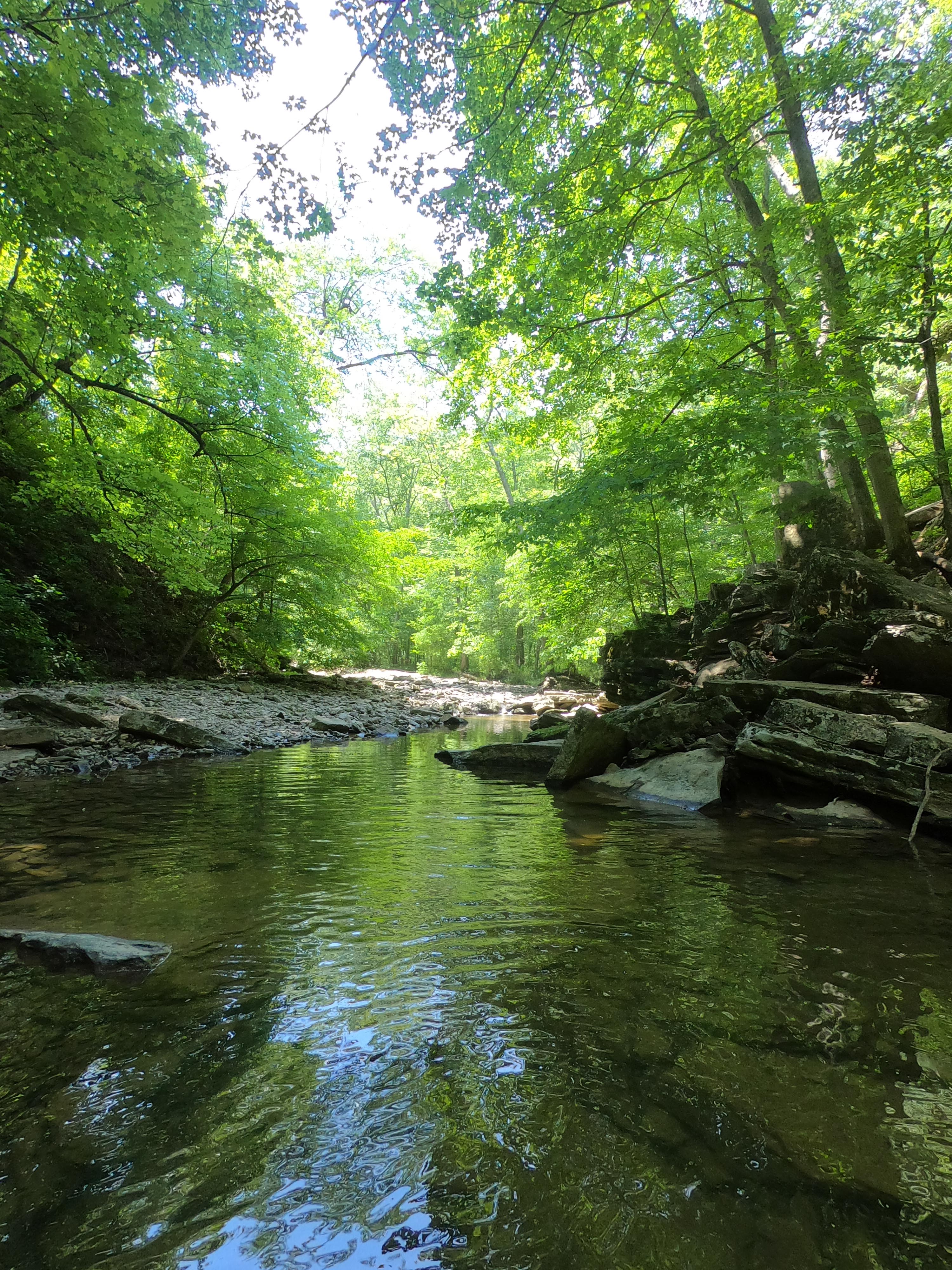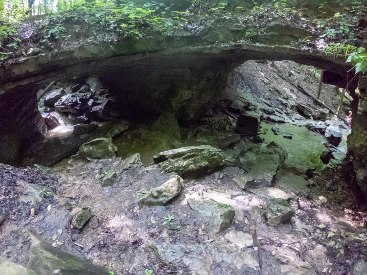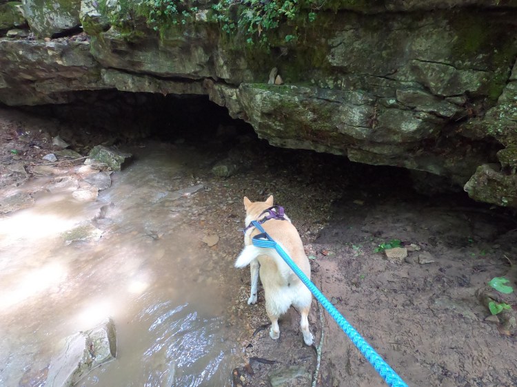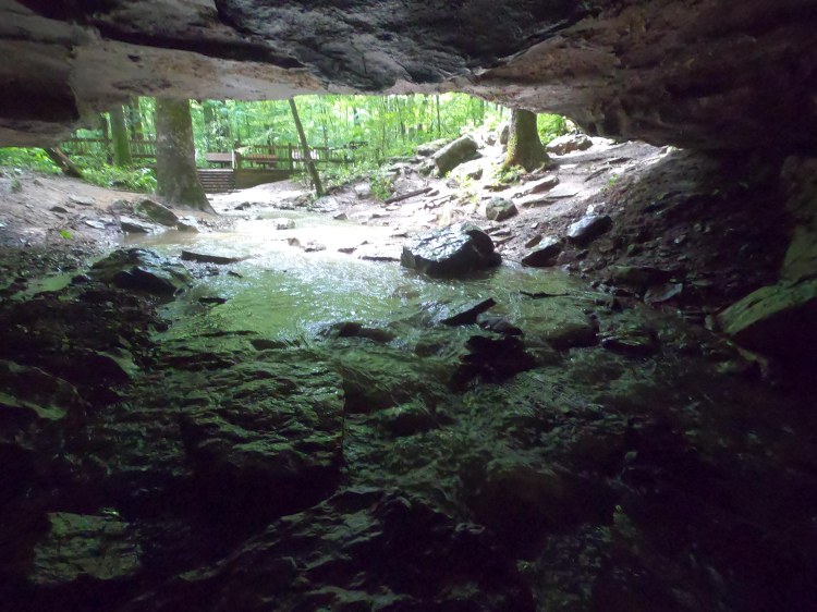 After re-centering myself and deciding I was safe enough, I decompressed by taking another hike from the campground. The park is famous for the Wolf Cave, and it is only a 2 mile loop from the campground. I think this trail would normally include the crossing of many riffles. See the above once-in-a-decade rain storm. I soon questioned my choice to wear hiking shoes. All hope of dry feet was abandoned at the actual cave when my desire to explore the low space out-weighed my sense of comfort. The cave itself is low, but perfect for small children or short adults with big packs to duck walk. In theory, you can crawl to the other side. I think the water was too high, cause I sure didn’t see how that would be possible.