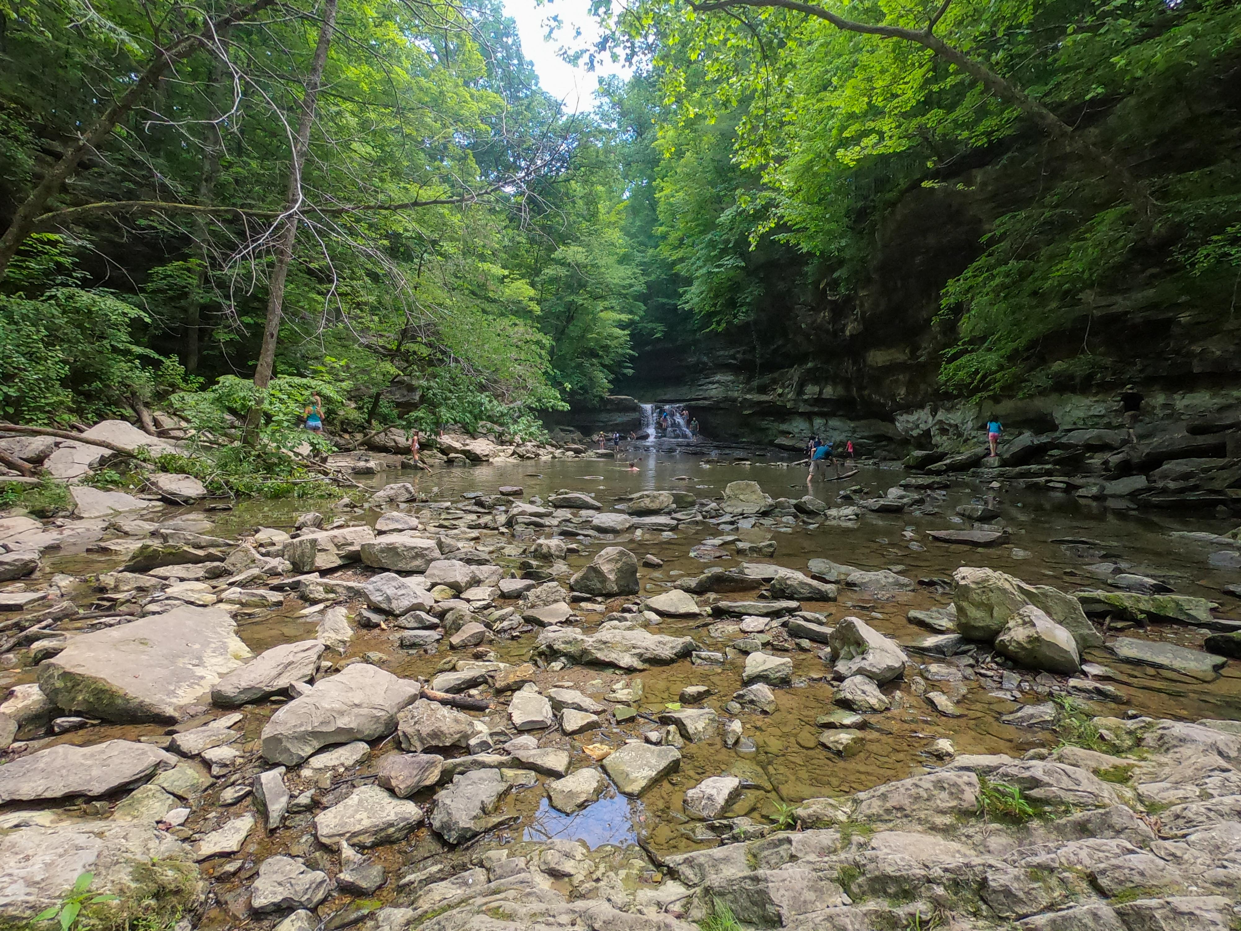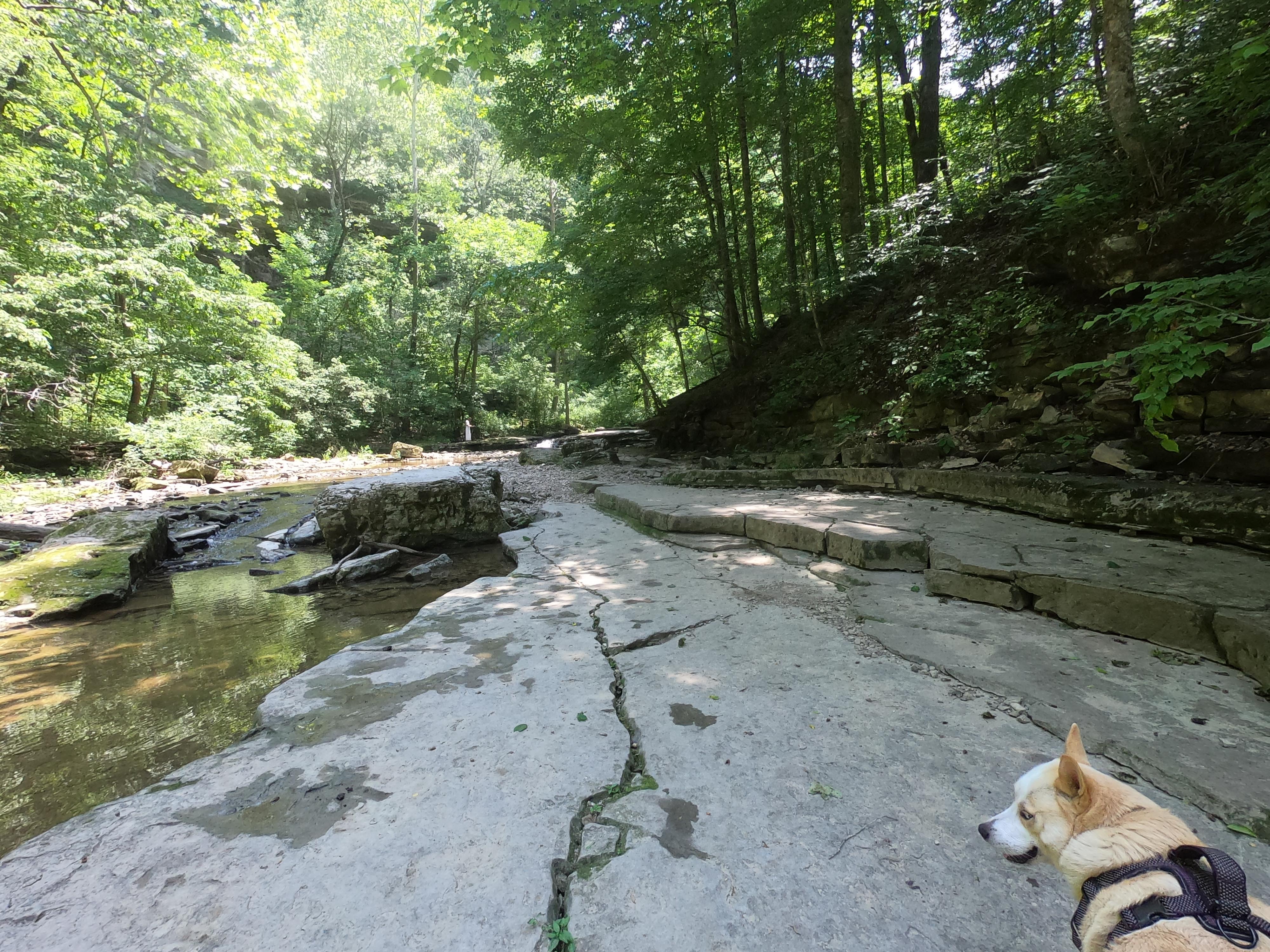 It is not obvious from the hiking map, but it is possible to hike about a mile to falls as long as the water is low and/or you don’t mind getting your feet wet. I strapped on my Chacos and Blue and I enjoyed the cool waters on the sweltering day. To make this hike you can connect to Trail 7 between sites 174/175 or across from the fresh water fill in Loop A. Head left on Trail 7 until it ends. Pick up Trail 10 and descent 147 steps into the canyon. Here, Trail 10 veers right, but you can easily cross the creek in lower waters or the balance-inclined can cross a log. On the other side of creek, Trail 3 continues left, essentially by walking in the creek. Trail 3 diverges at the Creekside shelter. One route is more creek-walking, while the other, more developed trail climbs to the falls overlook. Both are worth exploring as a loop. The falls themselves were nice and lots of families climbed and swam, even though it was a weekday. The entire trek from the campground to the falls was about a mile, but the wading through the water made it slow going.