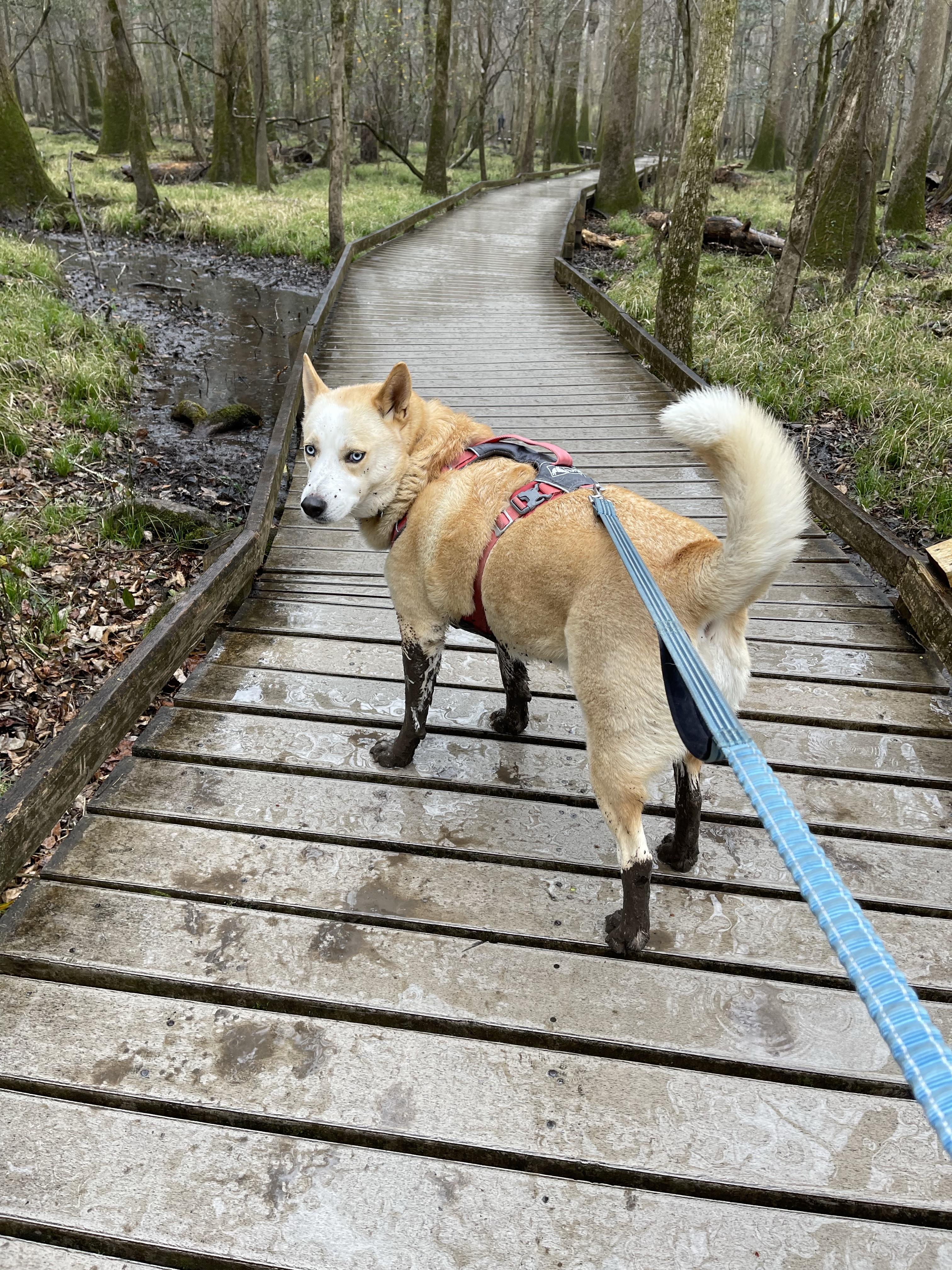 Blue was excited for the hike. We had spent the previous two weeks in south Florida so she found the cool air invigorating. I should have predicted it, but the very first time we reached an area without railings, she dove into the mud. This is not normal mud. This is swamp mud called “Dorovan muck”. I’m not exactly sure what that means, but I learned it is actually eight feet deep. So of course my Swamp of Sadness fears activated into panic of losing my beloved pet. Blue must either be a very happy pup or the actual muck may not be that scary because she only went about six inches deep. But the muck stuck. There was no denying to the rangers that Blue had broken one of the Leave No Trace rules and ventured off the boardwalk. But she was a happy dog and enjoyed her hike.
