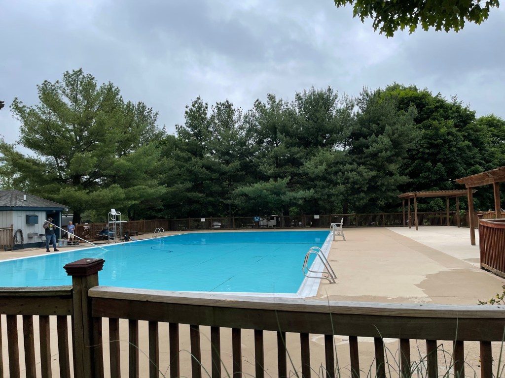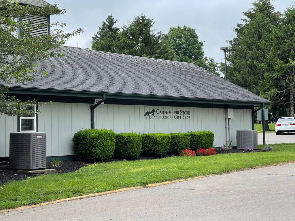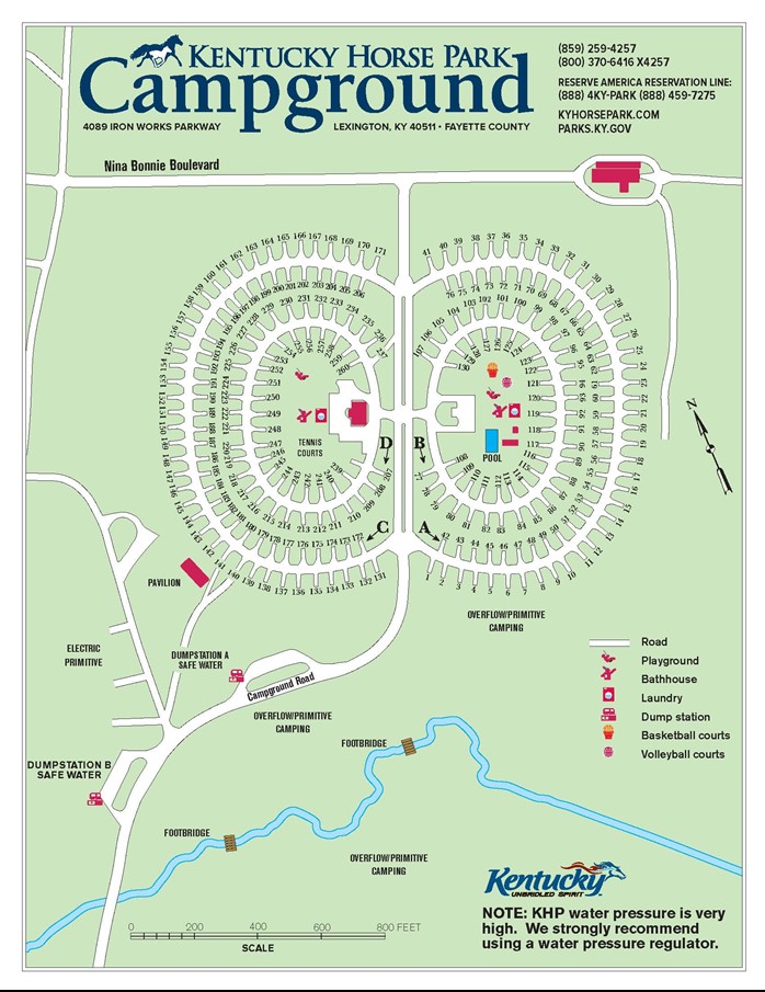 The Kentucky Horse Park Campground is 260 sites arranged in concentric ovals, 2 on either side of the main road. The rolling bluegrass hills and white rail fences from the surrounding horse farms continue in the campground. All sites have water and electric and are spacious, especially for a private campground. Inside each of the loops is a public area. One side hosts the pool and the other the tennis courts. Showers and laundry are available in both. The campground store and check-in is located in the center of the park. It is a relatively well-stocked store with a nice selection of beers including some local microbrews.