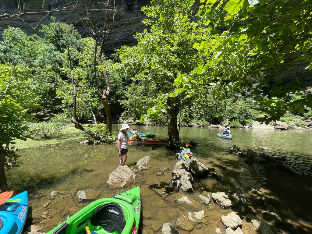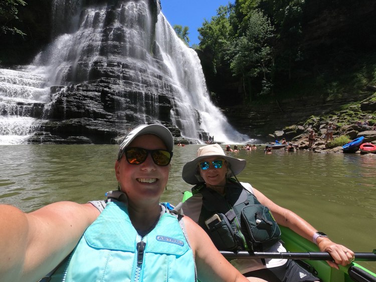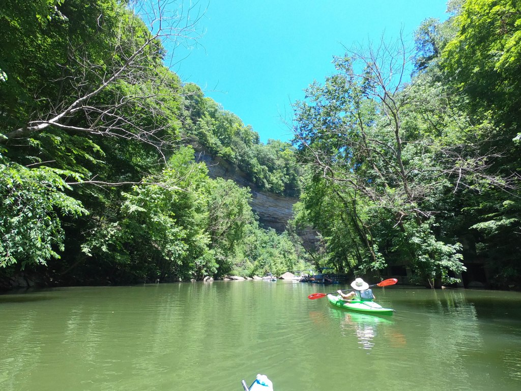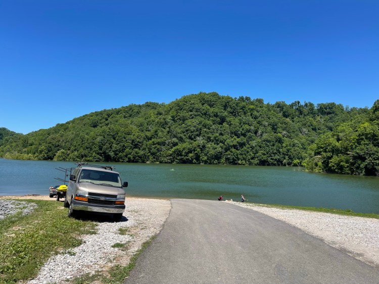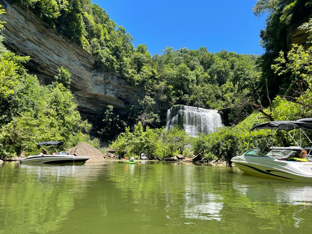 The best way to visit Burgess is via kayak. Burgess Falls drops in to the giant Center Hill Lake. We camped at Edgar Evins State Park. Though it also on the lake, by car it was nearly a 45 minute drive. The best put-in for the falls if kayaking is Cane Hollow Recreation Area. Some older reviews mention sketchy roads and parking. It seems the area has been recently updated to include pavement all the way in, a large parking area, and (dirty) port-a-johns. However, the road is still incredibly steep and the large lot was more than half full on the Saturday afternoon we were there.