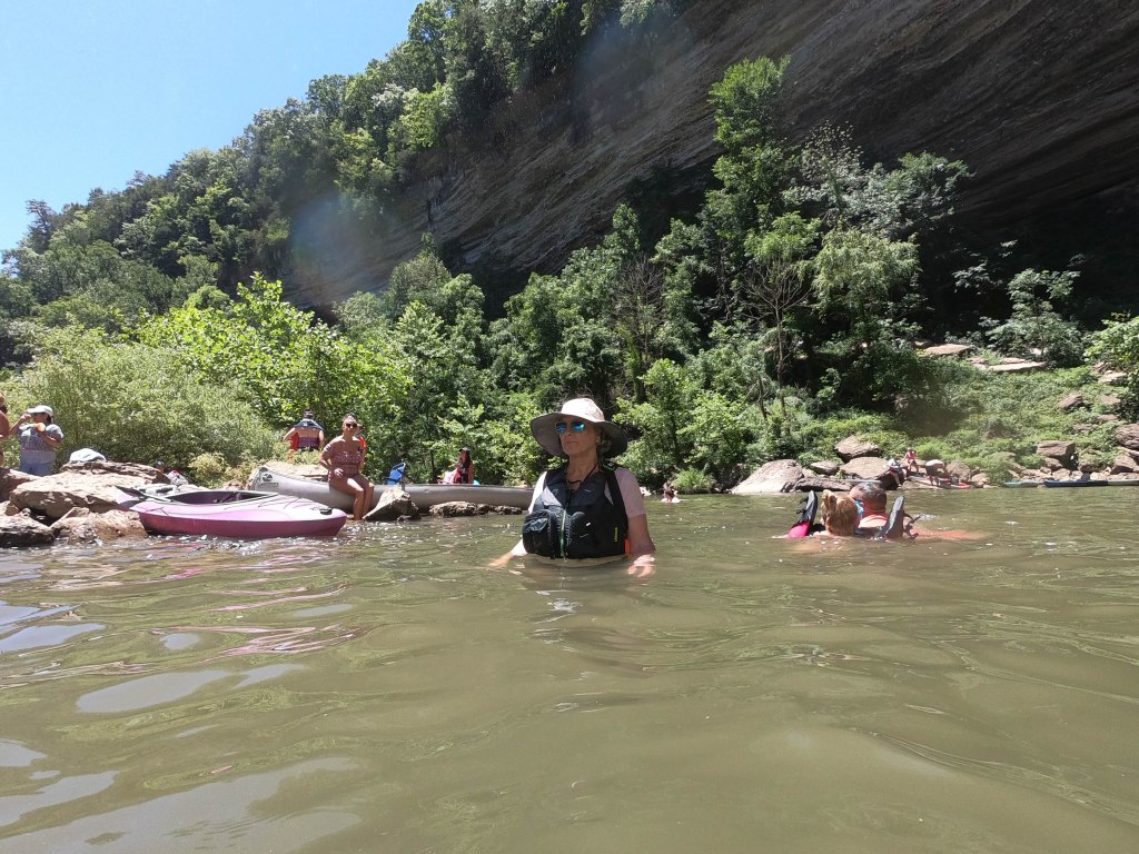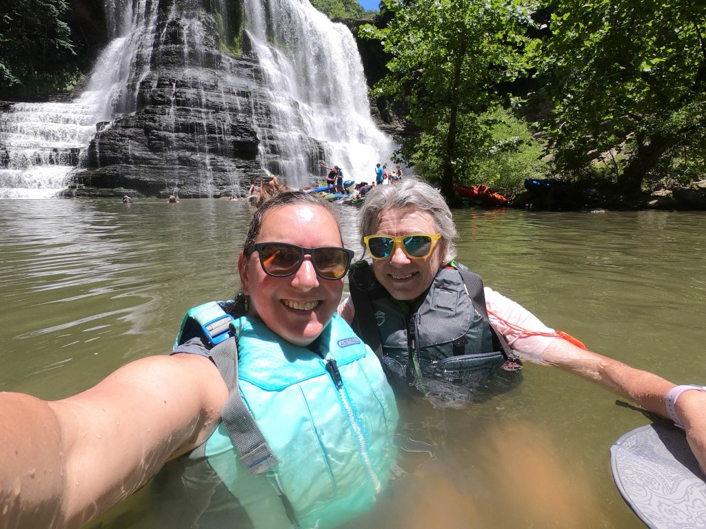 After eating, we took advantage of the cool water and swam with our PFDs on. We were surprised to find that we could walk over rocks until fairly close to the falls before needing to swim, but we were very careful to stay safe. Keep in mind this is a very remote area with little to no cell service. We saw many people taking awful risks – climbing cliffs to jump, swimming without vests. The area used to be a mill and the skeleton of old scrap metal hides just under the surface. With a little caution, the area can be an amazing oasis, but I can guarantee the stupid carelessness there will eventually lead to deaths in the area. In the meanwhile, as conservative old ladies, swimming beneath the falls will definitely be a highlight of our summers.
