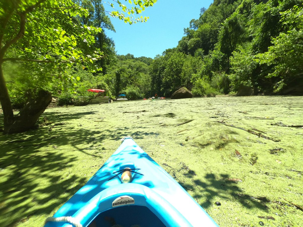 As you approach the falls, there is a giant puddle of sludge composed of what I can only describe as flotsam and jetsam. Paddling through is tough and dirty work, but absolutely worth it because the bigger boats cannot make it past. Paddlers only beyond this point!