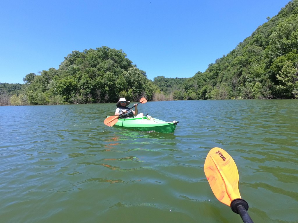 Roundtrip, the paddle is just under five miles. It took us just about an hour each way but we weren’t paddling particularly hard. There was very little current and the places with strong wind cooled off the hot summer sun. Generally the route follows an old flooded valley. Dead trees emerge from the water in odd places. It can be a little eerie. Navigation on a summer Saturday was fairly easy as we just followed the crowds. On another day, I would say it would still be fairly obvious. Once leaving the parking lot, we did soon loose cell service (Verizon), so I would suggest loading maps well before arriving. It is also worth noting that boats from the main lake also make this side trip. We shared the route with pontoon boats, wave runners, and wake boats. Most were very courteous, but the occasional blow-hard had to flex his virtual masculinity by revving past paddlers. It was mostly more annoying than dangerous, but in places the passages were narrow enough where I could see it being a problem for less experienced paddlers.
