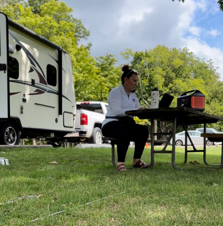 An hour down the road I stopped at Kickapoo State Park to work for the morning. I found a nice little picnic area and set up office with my Jackery and hot spot. It was lovely working in the sun and Blue got a long lead to explore a field – where she found and immediately devoured an old greenie lost by a previous dog. Her version of road food is definitely gross.