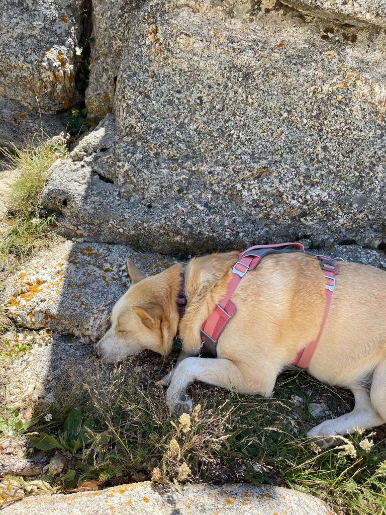 The descent was not much faster as Blue still shade hopped for frequent breaks. We were pretty continuously leapfrogging with an elderly solo hiker. Fortunately, at about mile five, the trail crossed the tiniest of streams. It was just enough for Blue to lie down, get wet, and drink her fill. This was clutch for the final two miles, especially since there was a final climb on the way back to the parking lot.