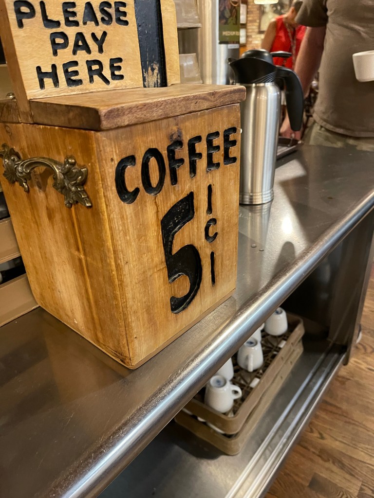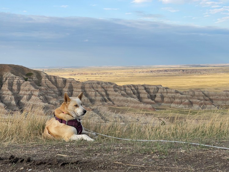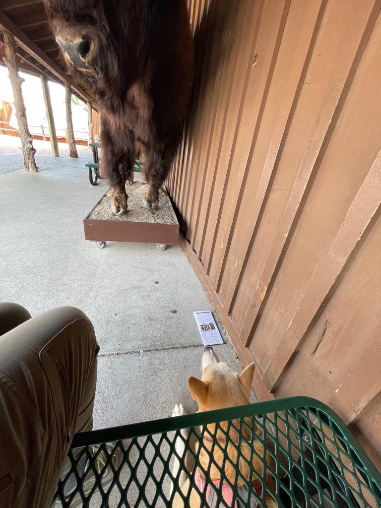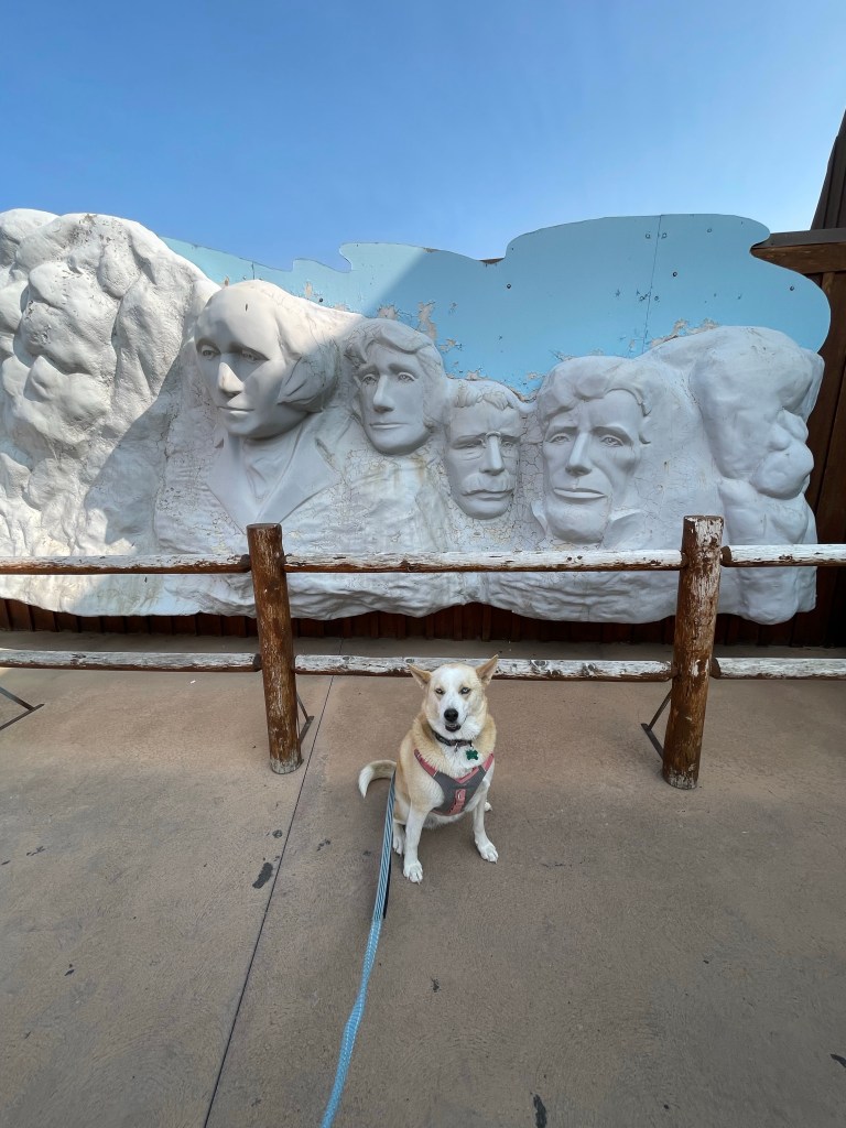 And there are some parts that are worth-while. I enjoyed breakfast to-go, including some of the famous donuts and cheap coffee. The entire location, besides the places serving food, is surprisingly dog-friendly. In the “Backyard”, an outdoor area with multiple props for South Dakota vacation photos, Blue reluctantly encountered a taxidermied bison. And since she didn’t get to visit the Mount Rushmore National Monument, I told her the six foot replica was the real thing.