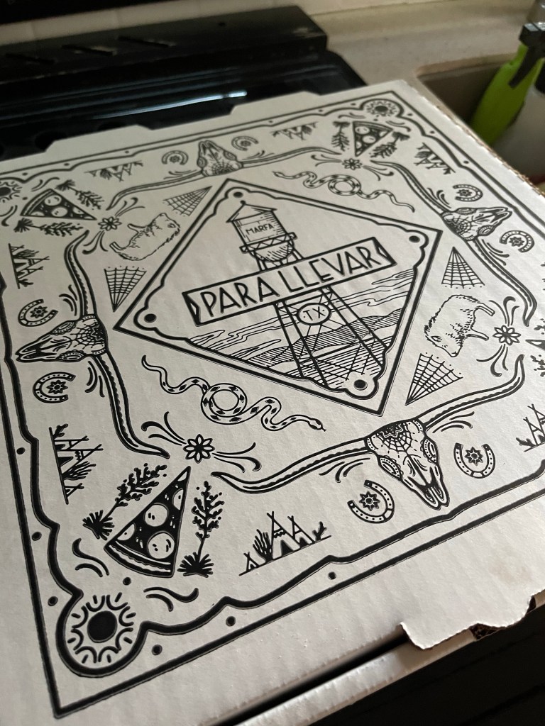 Dining options in Marfa are surprisingly plentiful. One establishment even features burritos favored by celebrities. But I had been craving pizza for a while and picked up a pizza in one of the most beautiful boxes I have ever seen to take back to the rest area.