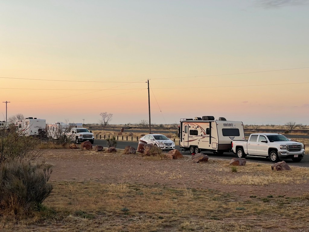Several other groups hid from the wind on the platform and scanned the horizon for anomalies. We weren’t exactly sure what we were looking for and there were several false alarms. As a birdwatcher, I of course had my binoculars in the trailer and retrieved them for a closer investigation of some possible suspects. With the help of the binoculars, we soon realized we were seeing the famous Marfa lights. Orbs appeared, disappeared, split apart, merged, and zoomed out of sight. The colors varied from orange, to blue to white and plenty of hues in between. As the evening wore on, and those who had enjoyed a dinner in town began to roll in, I assumed the temporary position of temporary Lights Mayor. Really, the consensus was that the binoculars were extremely helpful in orienting viewers to what they are looking for, after which it became much easier to watch the lights with the naked eye. It was quite a festive atmosphere with dozens of strangers marveling together. Eventually the cold outweighed the fun and it was wonderful to be able to retire to bed just a couple hundred feet away. Shockingly, despite the activity all night long, it was a rather peaceful place to sleep.