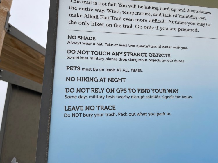 My stay at White Sands was short, but beautiful. What an amazing place! With more time I would have loved to explore this unique ecosystem and the surrounding area a bit more. I didn’t even touch the Alamogordo town – an area unique enough to merit a trailhead warning! This was a hiking first for me!