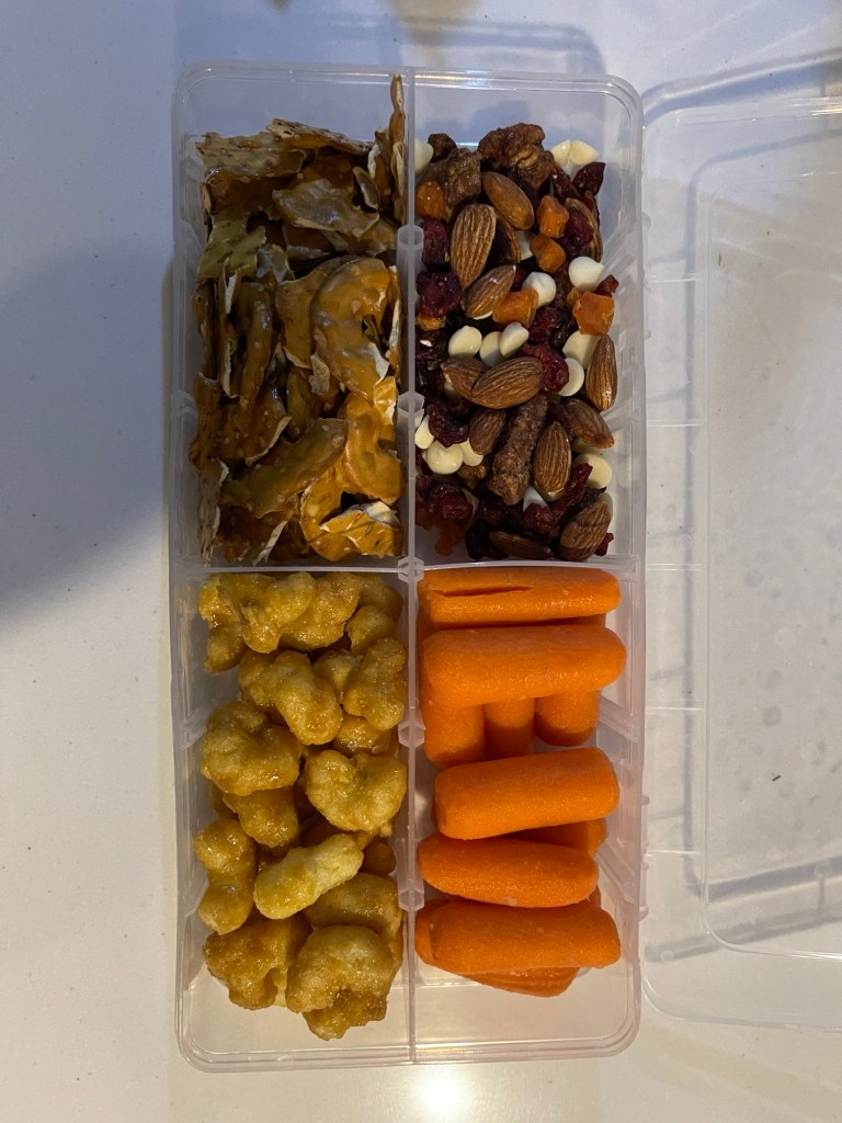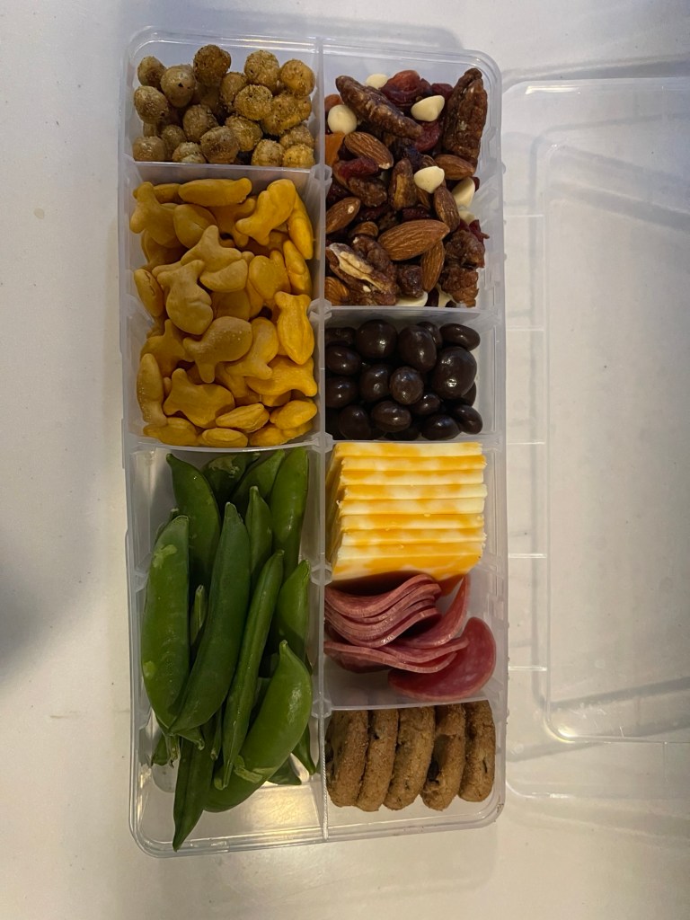 When shopping for a snackle box, be sure to find one that uses food-grade plastics. I have seen lots of people use an actual tackle box or cases designed for organizing crafts. I bought these from Amazon, but have seen others in store at Walmart, Target, and some grocery stores. I prefer one with adjustable compartments to accommodate small quantities of sweets as well as larger amounts of bulkier foods.